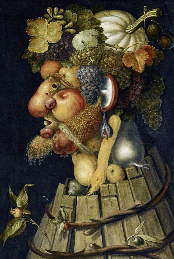 Quand Arcimboldo compose son Automne en 1573 à partir de fruits et de légumes de saison, il compose son torse des douves d’un tonneau et lui choisit comme chevelure des feuilles de vigne et des grappes de raisin qui offrent une riche palette du vert doré au violet profond :