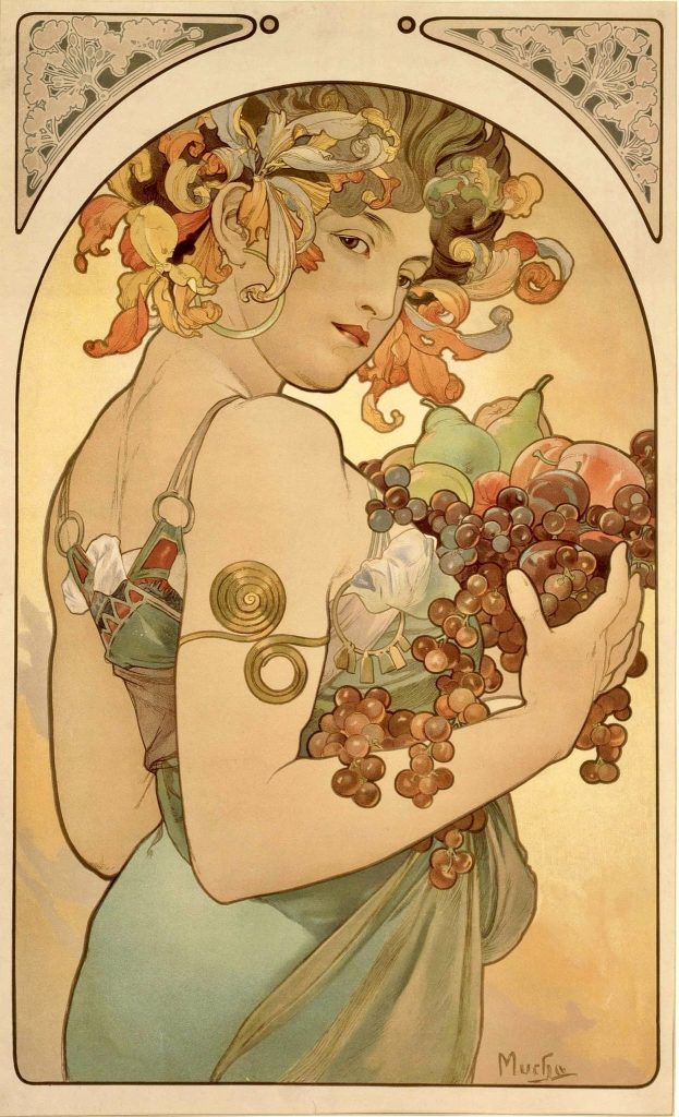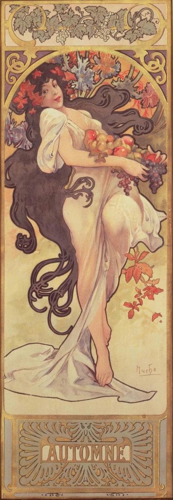 Dans ses célèbres allégories des saisons, Alphonse Mucha pare lui la femme-Automne de feuilles rousses et de lourdes grappes de raisin :