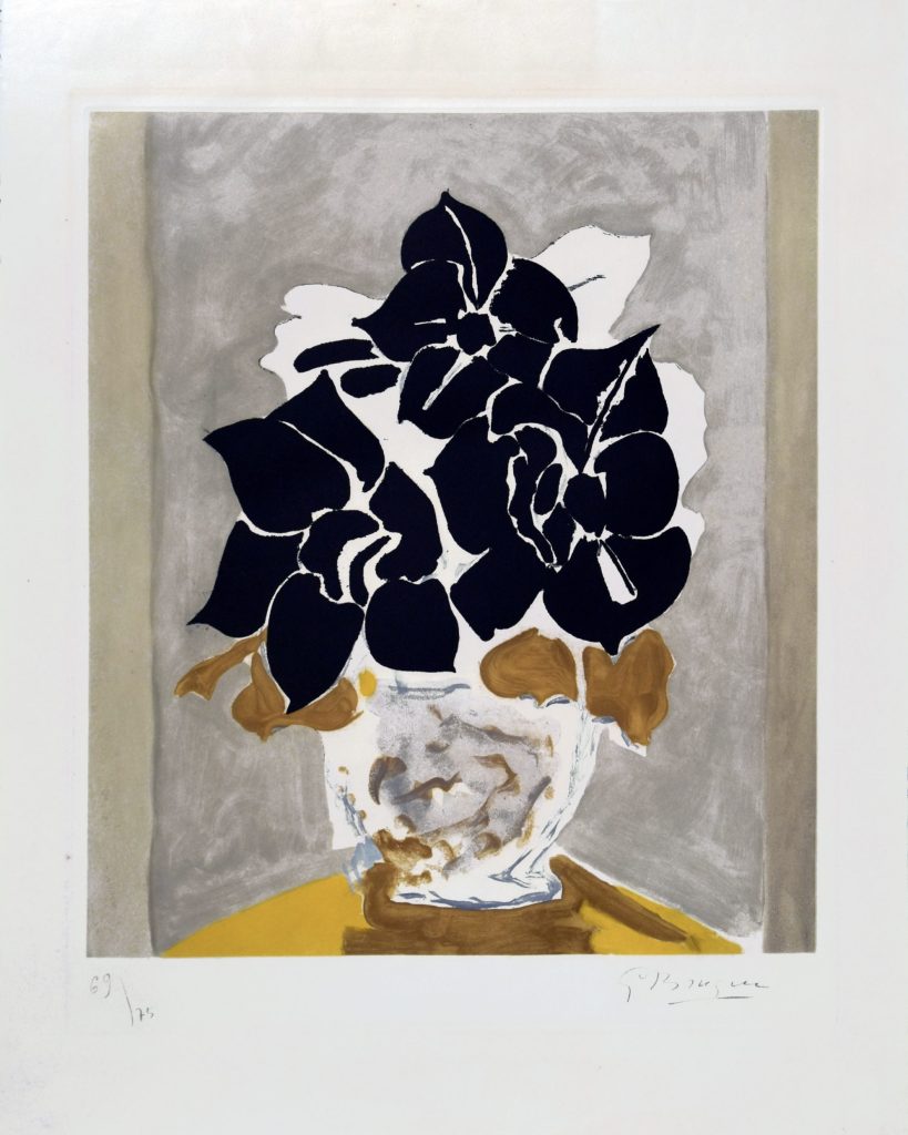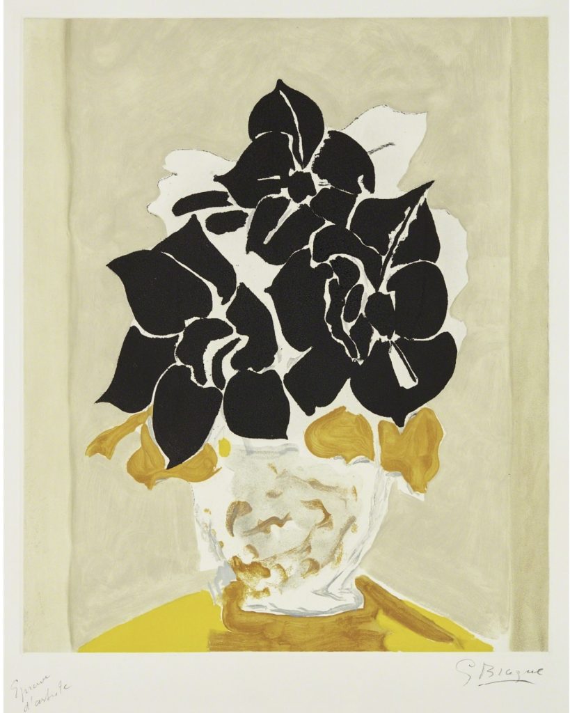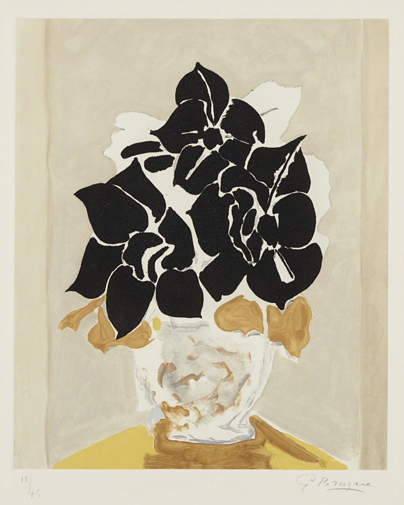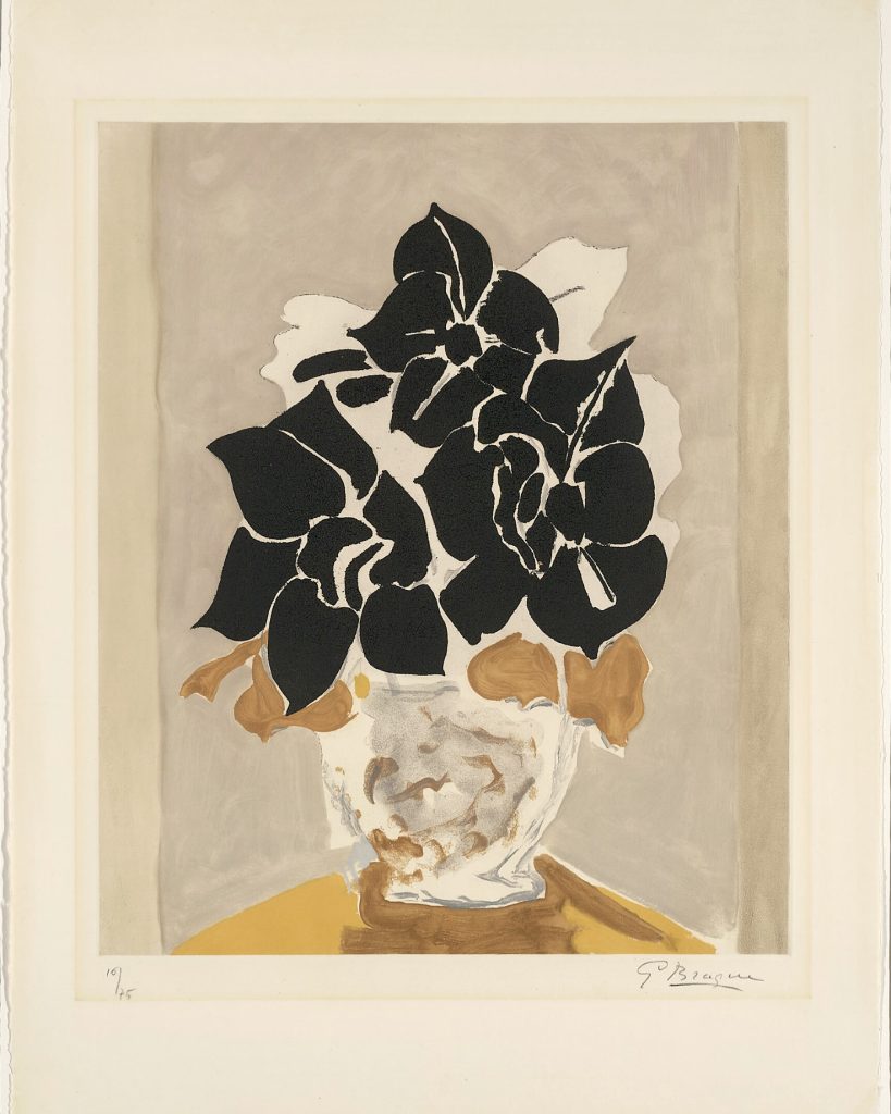 Pourtant, en 1958, quand Georges Braque répète le motif de l’amaryllis dans le champ de l’estampe, il limite sa palette à des tons gris, noirs et ocres :