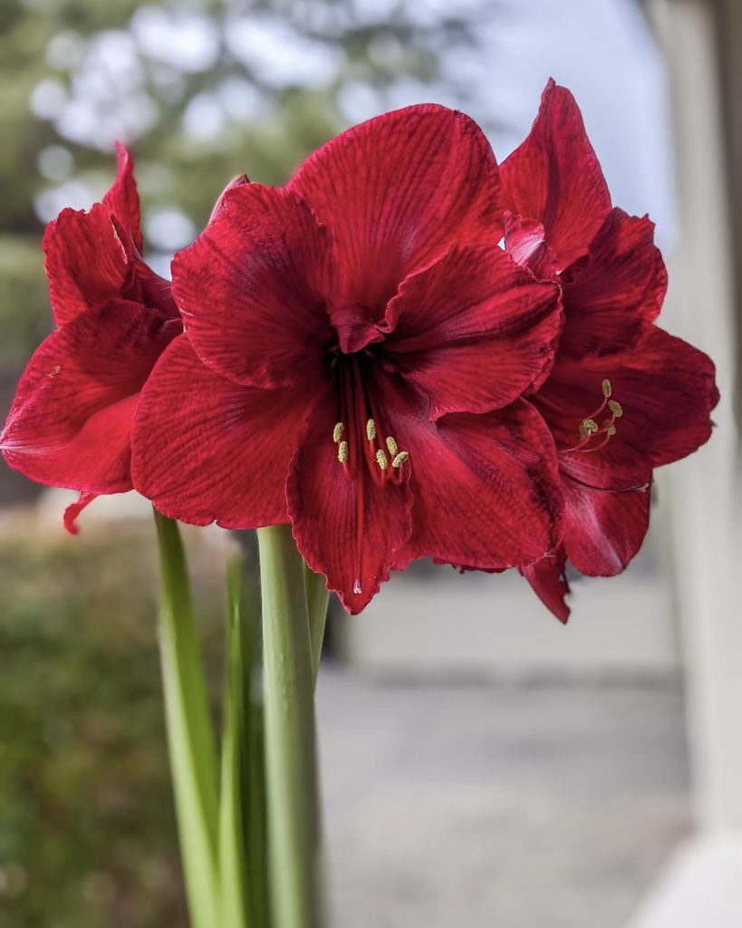 Le joli nom amaryllis m’évoque la saison hivernale et d’élégantes hampes surmontées de somptueuses trompettes écarlates ou blanches veinées de rouge :