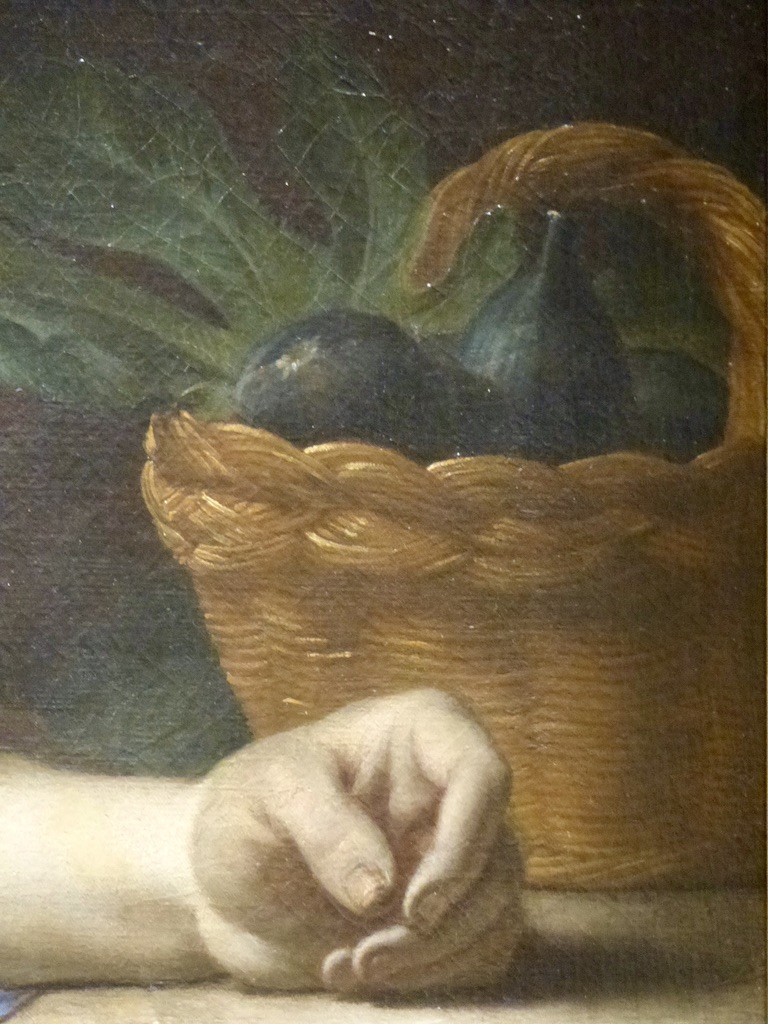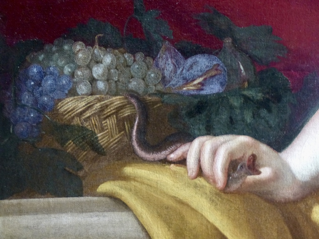 On ne remarque qu’ensuite le panier de raisins et de figues d’où sort un petit serpent à la gueule ouverte, ce qui permet d’identifier la scène sans ambiguïté.