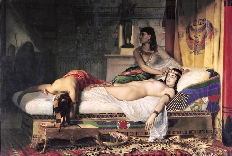 Dans la tradition antique, notamment chez Plutarque (Vie des hommes illustres, « Antoine », 86), Cléopâtre aurait fait introduire en secret un serpent venimeux dans un panier de figues, afin de tromper les gardes romains et de se donner la mort sans être empêchée, plutôt que d’accepter la reddition.