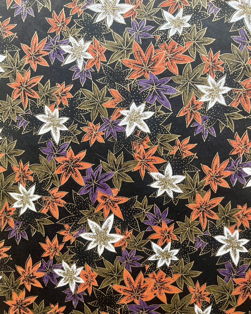 Pour célébrer l’automne, j’ai choisi un papier washi semé de momiji (feuille d’érable), qui mêle du violet à son camaïeu de cuivre et d’or :