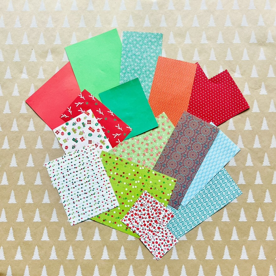 J’ai d’abord choisi quelques jolis papiers avec des dominantes de rouge et vert :