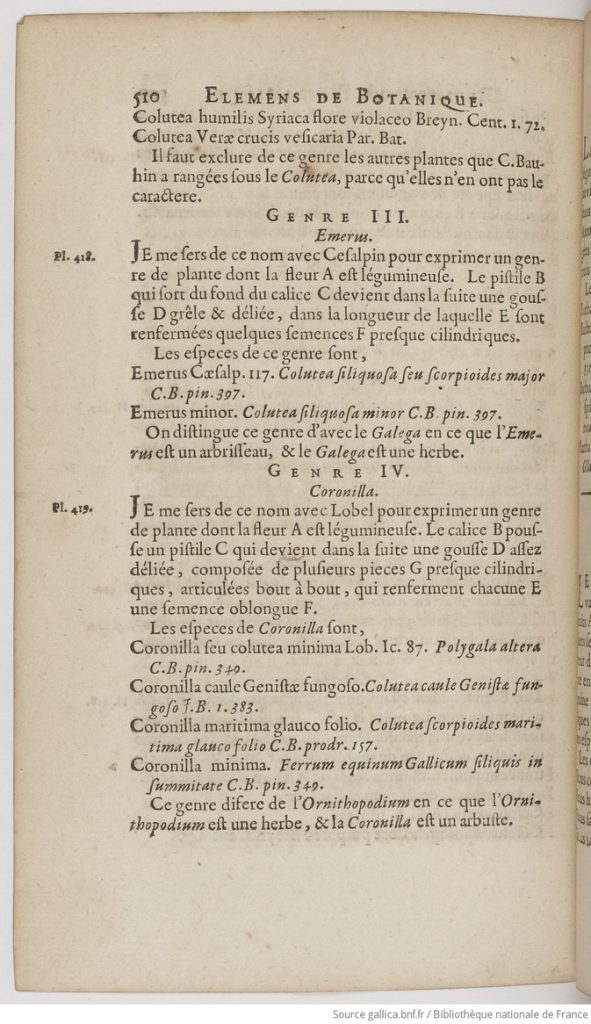 Avant Linné, c’est le botaniste Joseph Pitton de Tournefort qui a établi le nom de genre Coronilla, dans ses Elemens de botanique, ou Methode pour connoître les plantes de 1694 :
