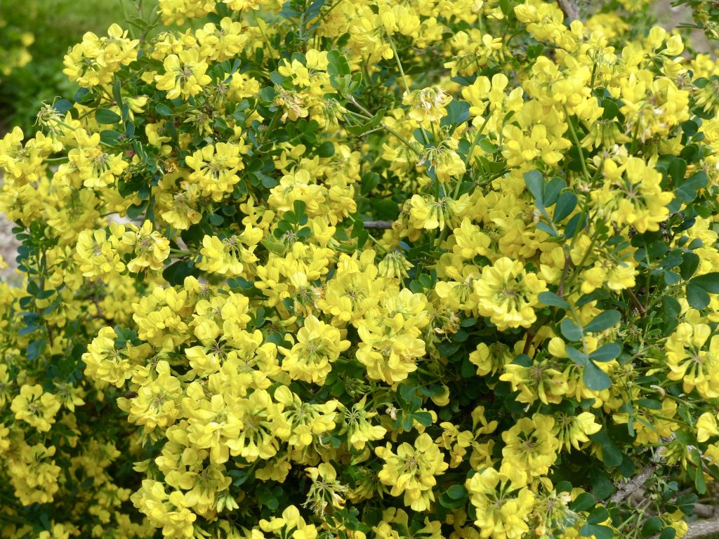 Les espèces jaunes sont sans doute les plus spectaculaires. L’une des plus répandues, Coronilla valentina subsp. glauca, forme de beaux arbustes arrondis couverts d’une myriade de petites fleurs jaune vif. Leur floraison, souvent très précoce, illumine les massifs dès la fin de l’hiver, comme en atteste cet arbrisseau photographié au Jardin des Plantes de Paris :