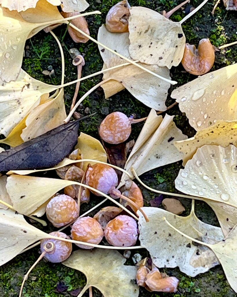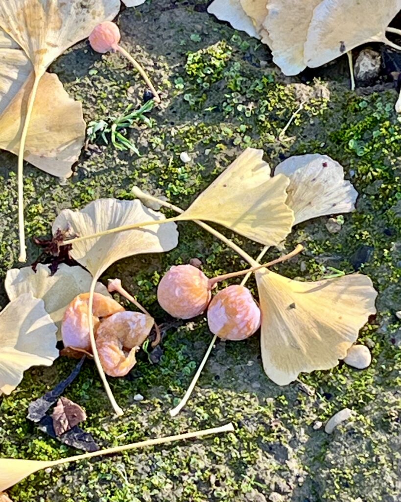 Fin novembre dernier, au Jardin du Luxembourg, j’ai ramassé quelques ovules de ginkgo tombés au sol :