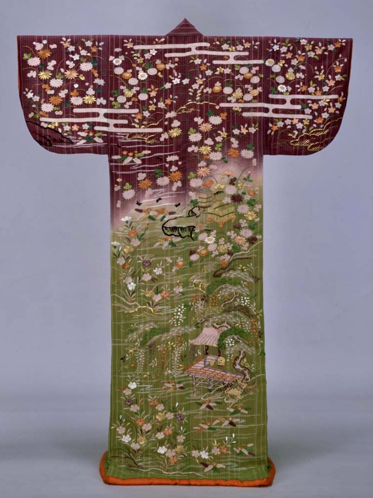 Ces formes peuvent être stylisées ou très épurées, laissant de larges zones vides. Cette utilisation du vide est essentielle : elle fait écho au concept japonais de ma (間), l’intervalle ou le silence, qui donne sens et respiration à la composition. Sur un kimono, la brume ne sert donc pas seulement de décor, mais structure la surface du vêtement, crée du rythme et met en valeur les autres motifs, ici les fleurs, kiku et kikyô :