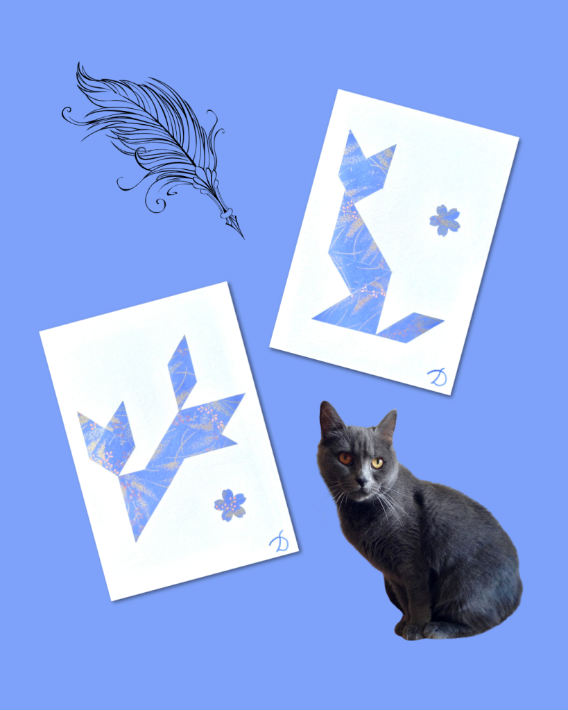 Comme si le bleu de Saha s’était mêlé à son souvenir, j’ai eu envie de créer des cartes buissonnières pour ma toute nouvelle collection Neko tangram, avec un papier washi bleu, or et argent :