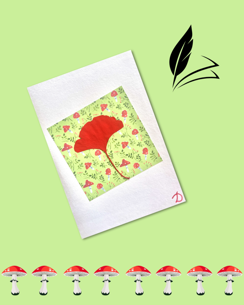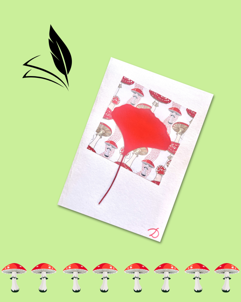 En ce jour du champignon dans le calendrier républicain, j’ai redonné à l’amanite sa couleur rouge pour l’associer à des feuilles de ginkgo :
