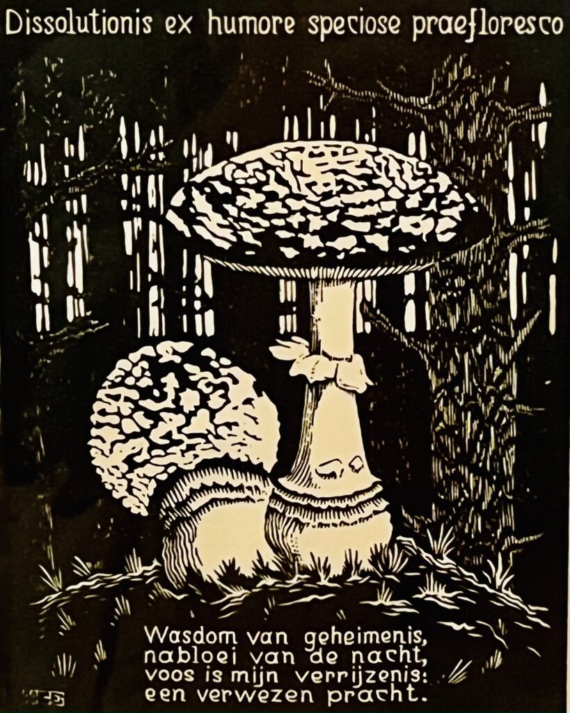 Il s’agit de cette gravure en noir et blanc, très contrastée, représentant deux champignons accompagnés d’un court texte :